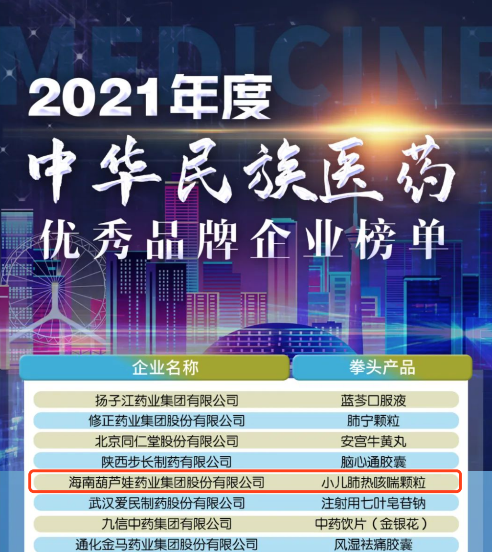 12月29日,全国工商联医药业商会发布了“2021年度中华民族医药优秀品牌企业榜单”,公海赌船710药业集团凭借黄金单品小儿肺热咳喘颗粒(4克)实力登榜。