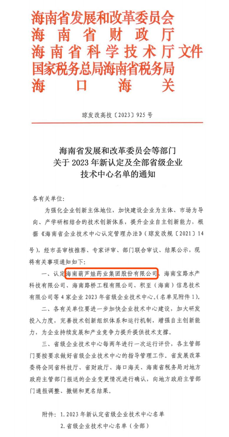 近日,海南省发改委等多部门联合公布了《关于2023年新认定及全部省级企业技术中心名单的通知》,其中,海南公海赌船710药业集团股份有限公司成功通过评审,被认定为省级企业技术中心,是本次获批的4家企业之一。